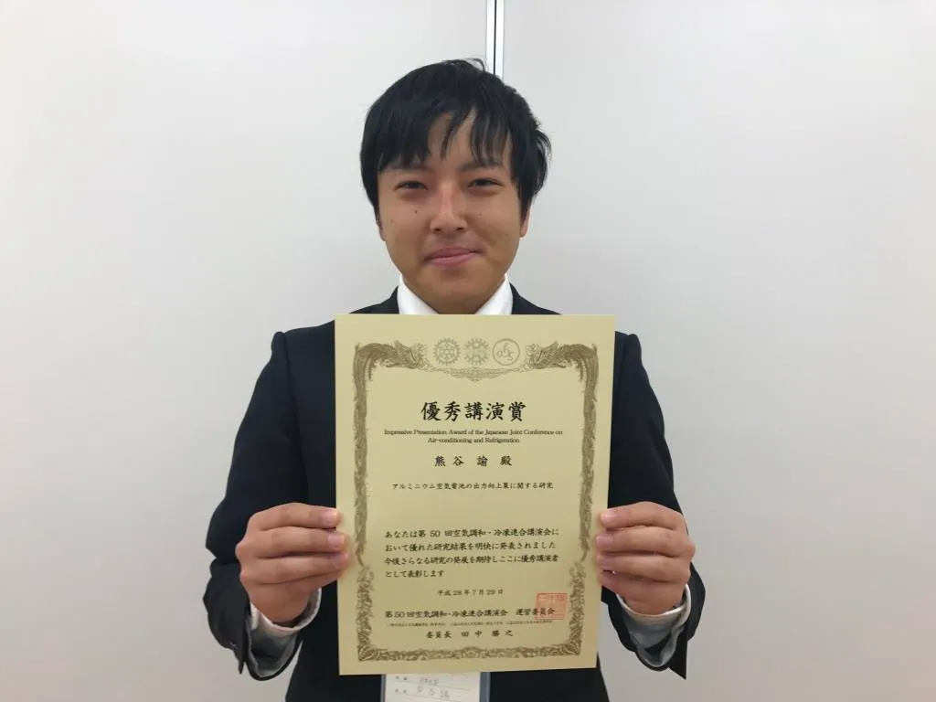 4月20日に東京海洋大学で行われた空気調和冷凍連合講演会の優秀講演賞表彰式にて、精密機械工学専攻の熊谷諭君が優秀講演賞を受賞しました。受賞の対象は、昨年の同講演会で発表された以下の論文発表です。論文名:アルミニウム燃料電池の出力向上策に関する研究優秀講演賞は、35歳未満の若手研究者・技術者の発表者に対して、論文内容と発表内容が審査され、明快な発表をおこなった者に与えられます。