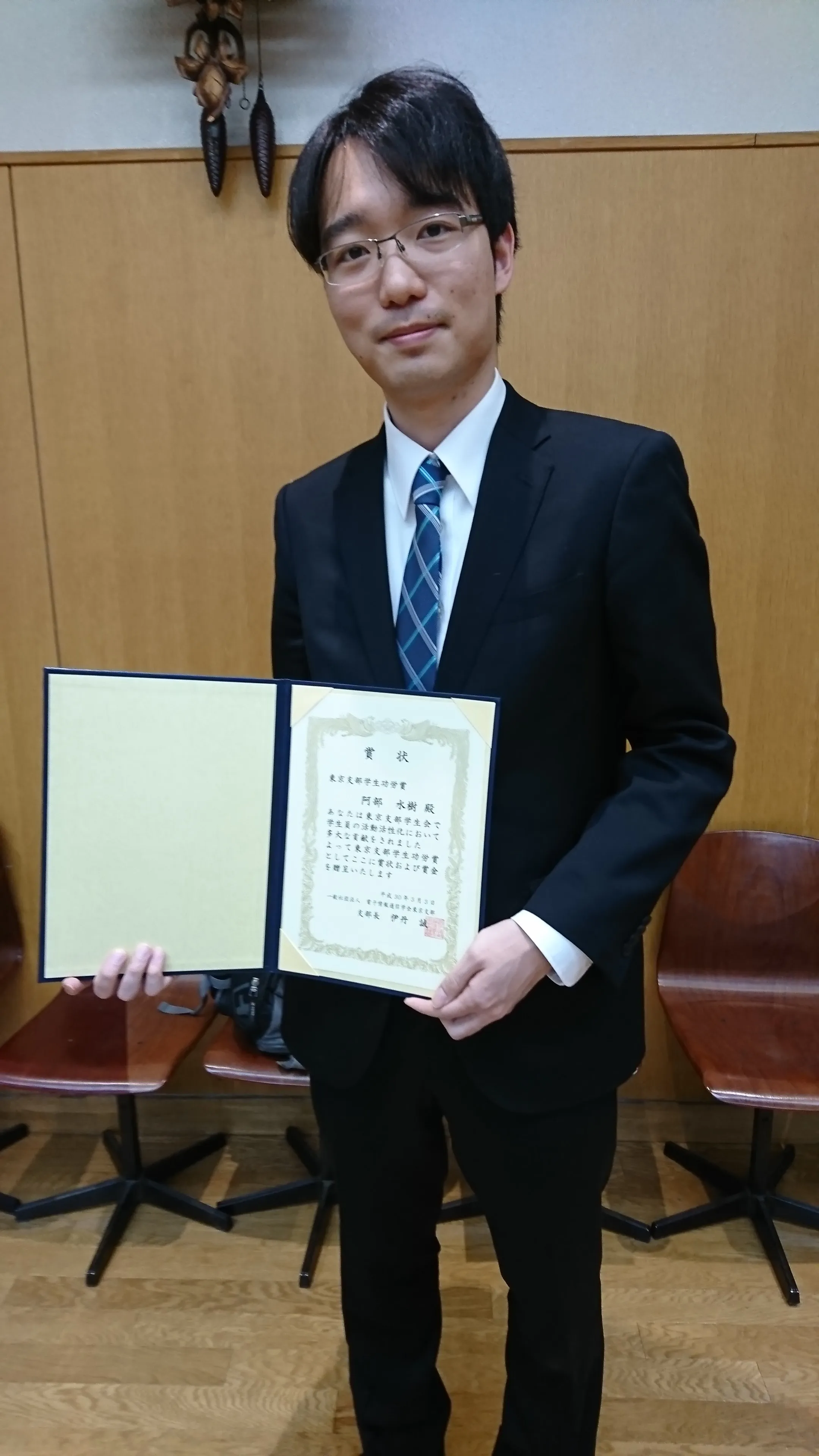 精密機械工学専攻の学生である、阿部水樹君が電子情報通信学会における東京支部学生会の活動で、東京支部学生功労賞を受賞しました。