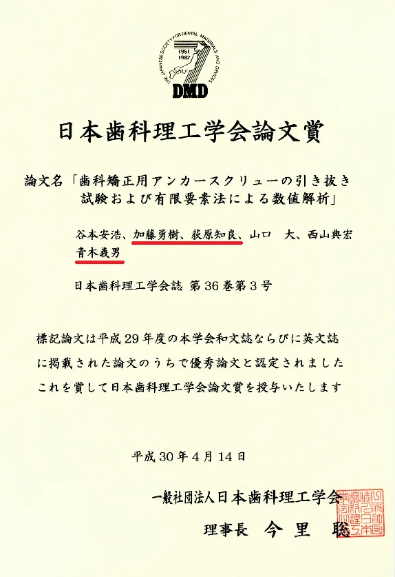 論文賞は日本歯科理工学会誌の欧文誌・邦文誌に掲載された論文から選ばれるもので、論文名「歯科矯正用アンカースクリューの引き抜き試験および有限要素法による数値解析」では実験と数値解析の多くの部分を理工学部が担っており、大学院生の修士論文が高く評価されたことにも繋がります。