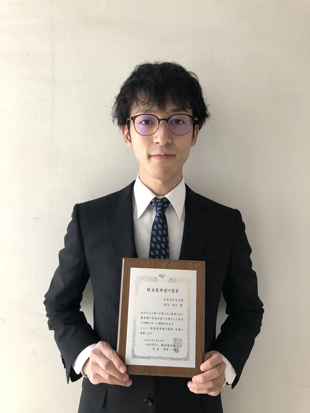 修士課程2年の熊谷祐太さん(指導教員:渡邉満洋)が、令和2年度軽金属希望の星賞を受賞しました。