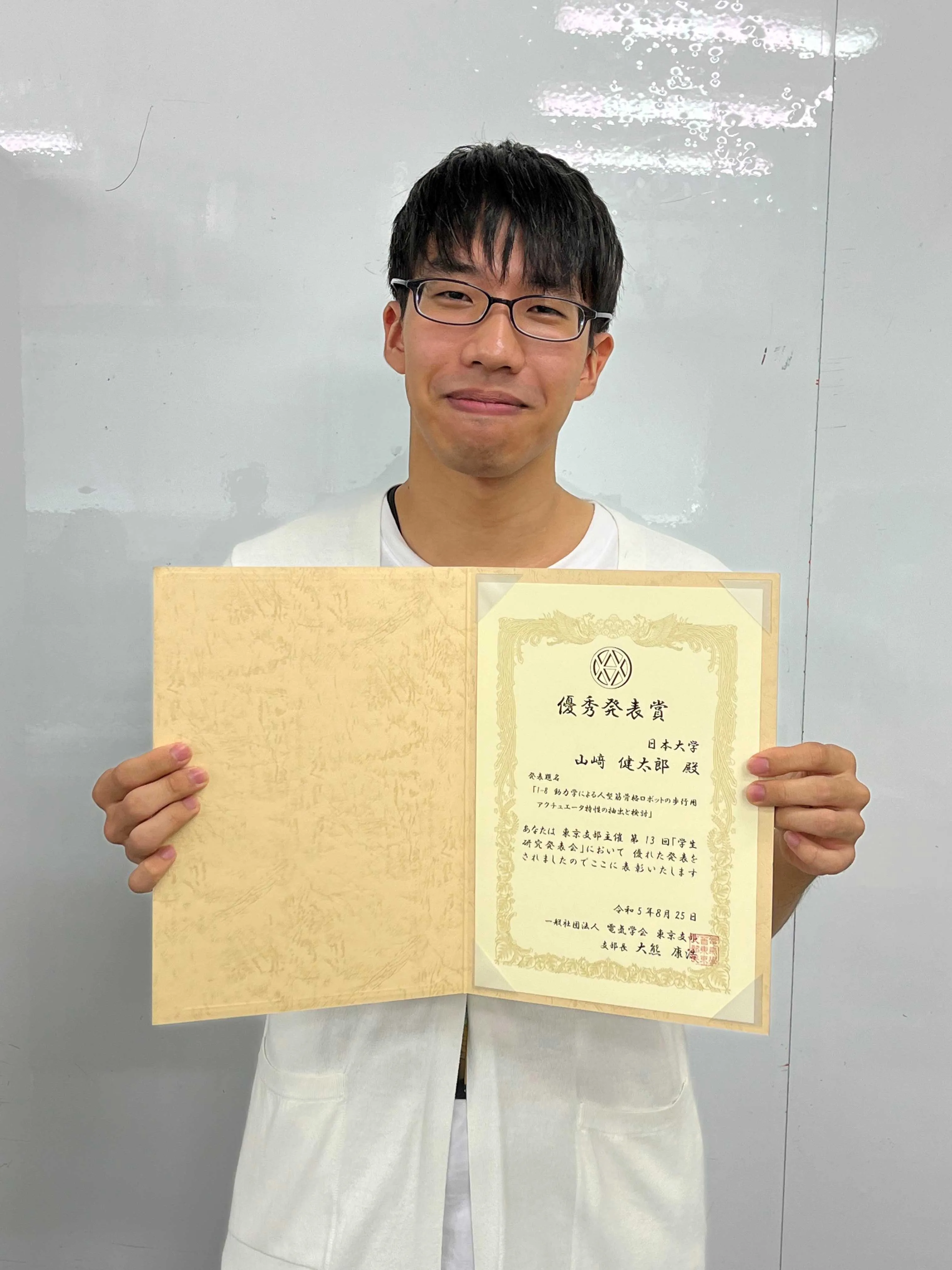 精密機械工学専攻博士前期過程1年生の山﨑健太郎さんが電気学会東京支部主催、第13回学生研究発表会で優秀発表賞を受賞いたしました。