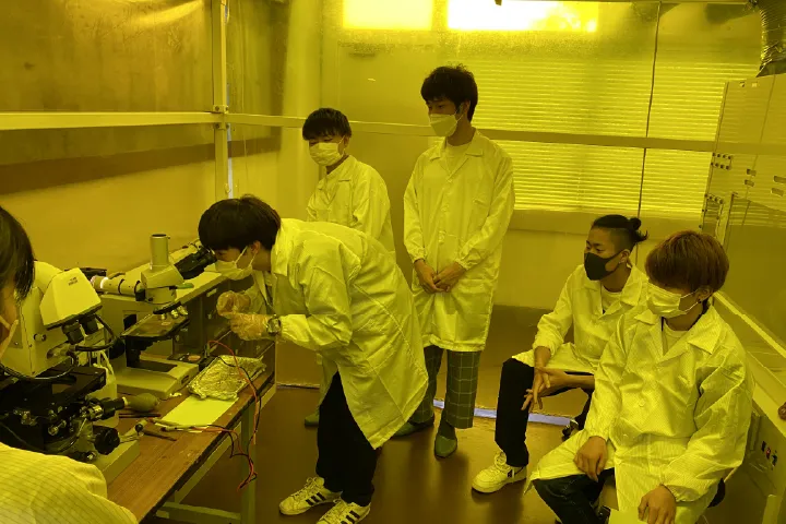 精密機械工学に関する各種実験題目について、実験と教員との試問を繰り返し、理解を深めます。写真は、クリーンルーム内で微細パターンを作製している様子です。