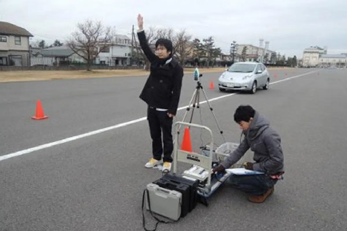 この研究では、ハイブリッド車や電気自動車に搭載される車両接近通報音の開発を行っています。車両接近通報音は、歩行者に車両の接近を知らせる役割をもち、気づきやすさと快適さの両立が求められます。特に近年は、歩きスマホのような副次的行動によって歩行者の聴取状態が変化し、車両の接近に気づきにくくなることが懸念されています。そこで、聴取状態や周囲の環境音を考慮し、より安全に配慮した車両接近通報音のあり方を検討しています。様々なモデル音を試作し、環境音に対する適切な音量や聴取状態に左右されにくい条件について、実車両を用いた交通総合試験路での実験を通じて研究を進めています。