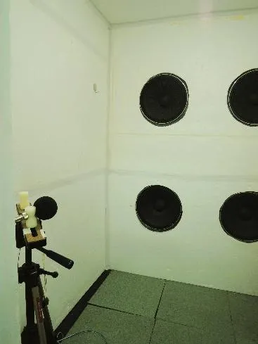 低周波音とは周波数100Hz以下の音で、近年では風力発電用風車から発生する音の大きさが時間変動する振幅変調低周波音が騒音問題となっています。人間は低周波音によって圧迫感や不快感を生じますが、和太鼓やバスドラムの低音は腹や胸に響く振動により快適感や迫力感を感じることもあります。この研究では、ウーファーを設置した防音室で振幅変調低周波音の感覚特性や生体反応を測定しています。また、低周波音によるリラクゼーション効果を調べ、ストレス緩和に役立つ福祉機器への応用等も検討します。