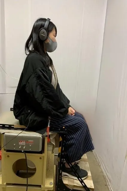 自動車や鉄道車両等の乗員は、振動と音を同時に受ける複合環境に置かれています。しかし、現在の振動環境評価の規格は振動のみが対象で音の影響は含まれていません。この研究では、乗り物の水平・前後方向振動を対象として、人体に振動と音を同時に与えた時の振動感覚(振動を知覚した時に感じる大きさや強さの感覚)を測定します。振動感覚と振動・音を構成する物理量との関係について実験的に検討し、振動と音を同時に与えた場合の振動と音の優位性、ならびに振動感覚に及ぼす音の影響を定量的に評価する方法の確立を目指します。