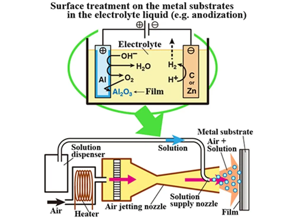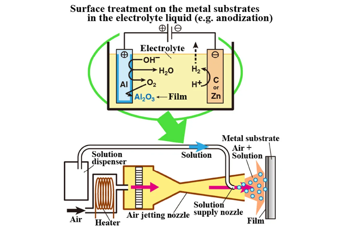 例えば、アルミニウム合金や鉄鋼に代表される金属材料は、アルマイトやめっき処理等のように、表面をコーティングすることによって審美性(見た目の美しさ)や保護性を良くしています。これらの技術は、一般的に、金属を専用の溶液に浸して、金属と溶液の化学反応を利用することで行われます(図1上)。これに対して、金属と反応させる溶液を、霧のような粒状にするとどうでしょうか。溶液と、金属の接する面積が増加しますね。すると、化学反応は、金属を液体に浸すよりも効率よく行われます。この結果、これまでの方法では作られてこなかったコーティング成分を、少ない工程で作れるかもしれません(図1下)。